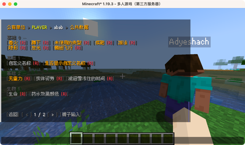 adyeshach开始主要命令单位编辑下级页面:公共数据本页总览下级页面:公共数据 公共数据是指 "所有实体类型" 都支持的数据类型,是属于实体自身的属性。 公共数据页面也可以通过 /npc edit <id> public-meta 打开。 绝大部分特性都可以通过字面意思理解,详细的解释请参考 技术文档 中的元数据部分。 无意义的数据 不是所有数据都如同字面意思一般有 直接的 视觉效果,比如高版本客户端中的 游泳、鞘翅飞行 在切换时并没有什么变化,但是却可以在 实体姿势 中切换到对应的效果。